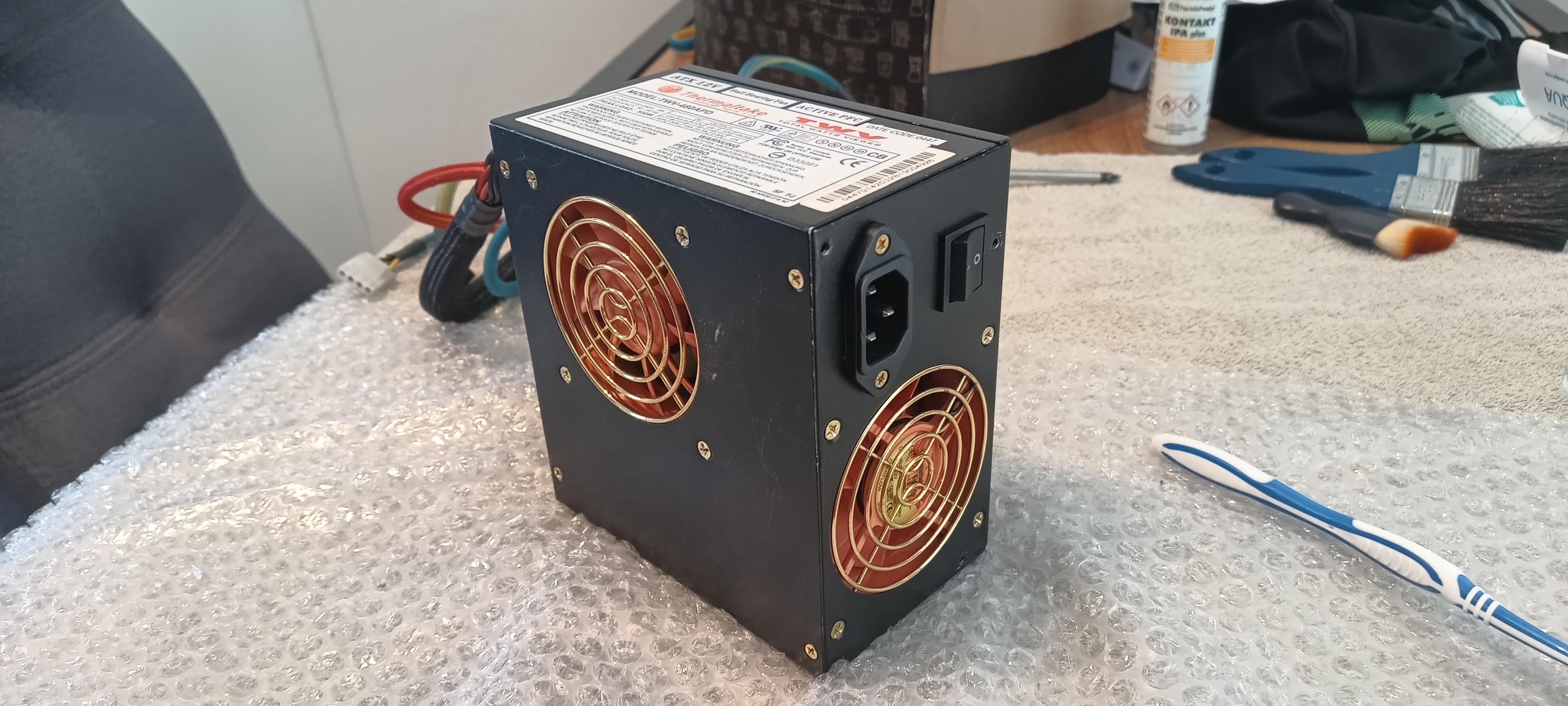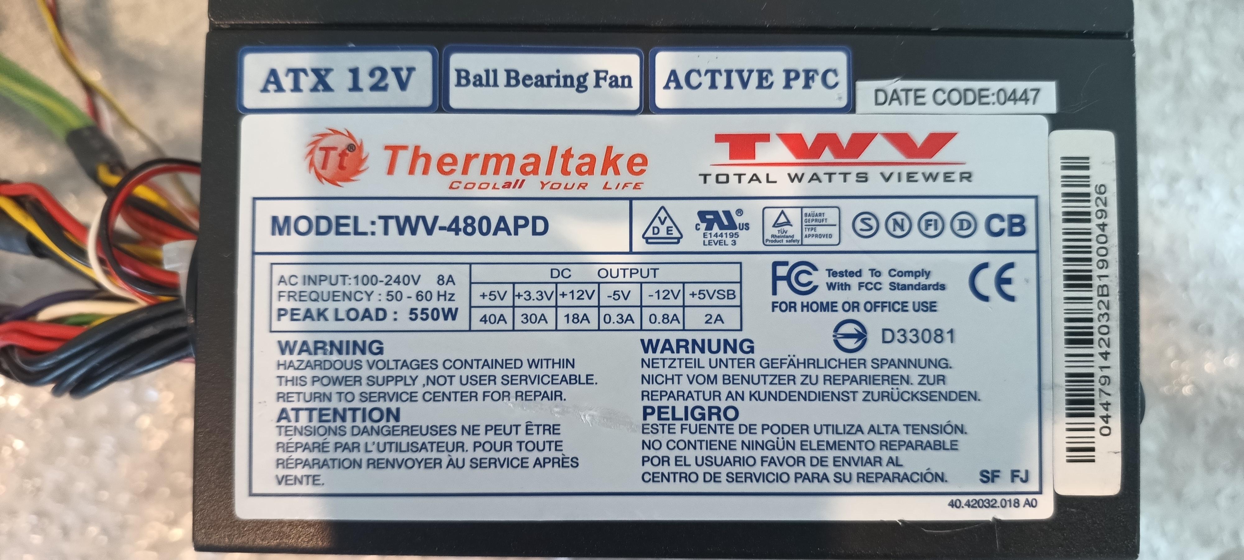 Wpadł w moje ręce ciekawy zasilacz Thermaltake TWV 480, idealny pod athlon-a XP, wizualnie trochę porysowany ale za to w środku wyglądał w miarę czysto i bez spuchniętych kondensatorów, raczej nie miał ciężkiego życia.