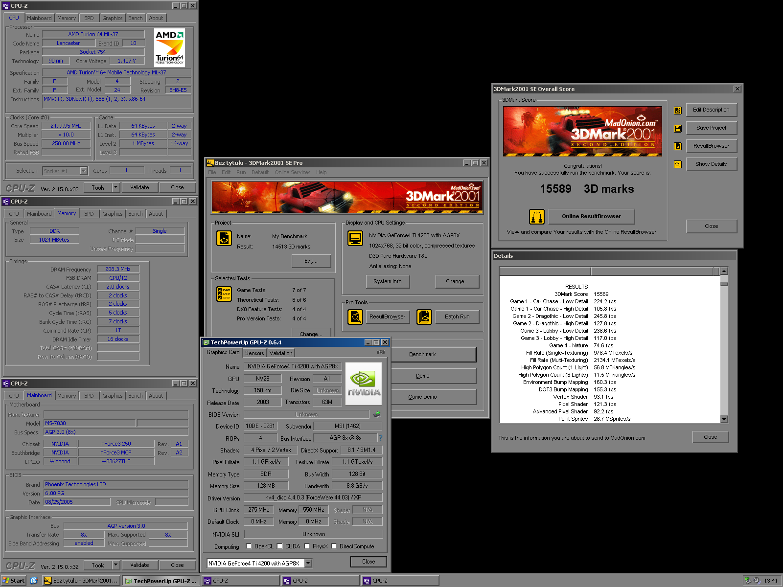 FX5500 nie ma podlotu do Ti4200, na papierze nie zapowiadała się taka chłosta w 3dmarku, po przetaktowaniu karty i procesora udało się lekko przebić 10tyś punktów.