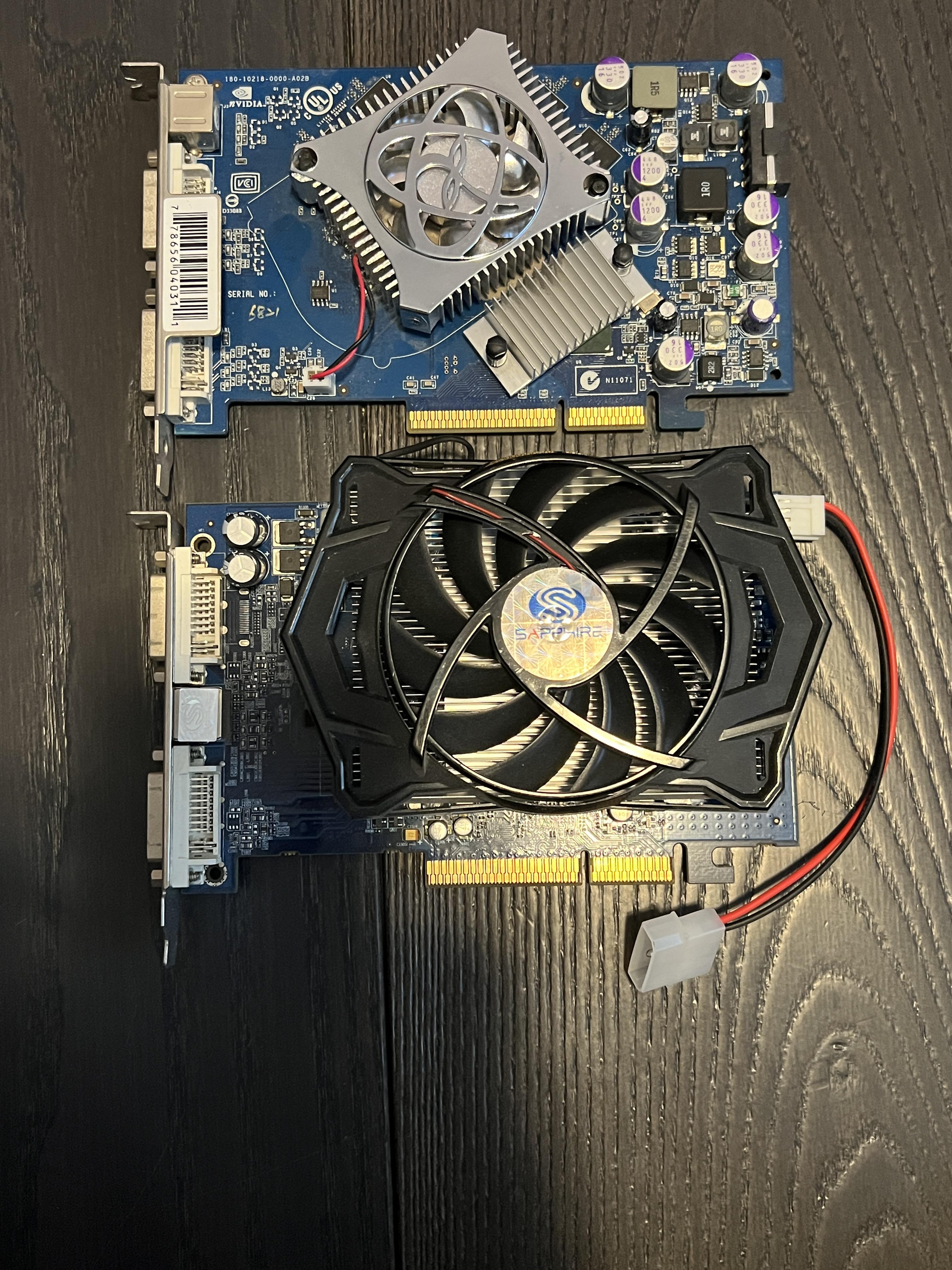 Tym razem wszystko sprawne oprócz wentylatora w radeonie 9800, ogólnie to moje parchate ręce nie zdołały zdjąć radiatora z tej karty i tak się z kołkami mordowałem że wyglądają jak platfusy ale dalej trzymają więc chyba zetnę je w cholere.