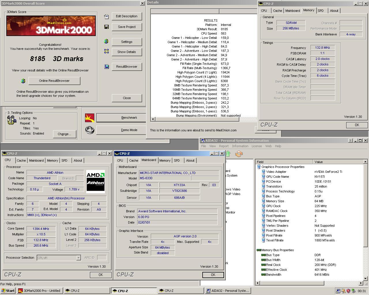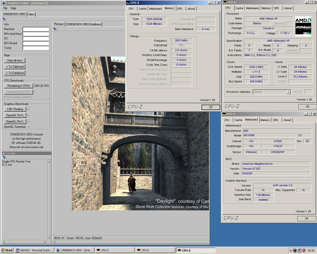 Zmieniłem zasilacz co by megabajt z dymem nie puścił podzespołów, radeon 9200 ustąpił miejsca 9600, oraz athlon xp 2200+ został zastąpiony bartonem 2600+ który ma swoje widzimisię z mnożnikiem, na A7N8X E jak i na taj płycie Msi KT6 jedyny działający mnożnik to 11.5 jak ustawie co innego (11/10x166/200) nie ma zamiaru przechodzić nawet post ale za to 11.5x166 oraz 200 po podniesieniu napięcia do 1.75 działa, co prawda żadnych dokładnych testów stabilności nie robiłem tylko cinebench 2003, 3dmarki i gry. Zainstalowałem parę gier z mojej kolekcji i aż miło przypomnieć sobie tamte czasy. Gta 3 nie lubi się z radeonem, przewalałem sterowniki od 3.9 do 6.5 i na każdych to samo, instalacja na nowo Windows xp również nie pomogła na znikające/migające tekstury i całkiem przypadkiem żeby wkleić ss do painta zauważyłem że jak zminimalizuję grę alt+tab i później wrócę do gry wszystko wraca do normy i tekstury gdzieniegdzie sporadycznie migną ale już bez znikania.