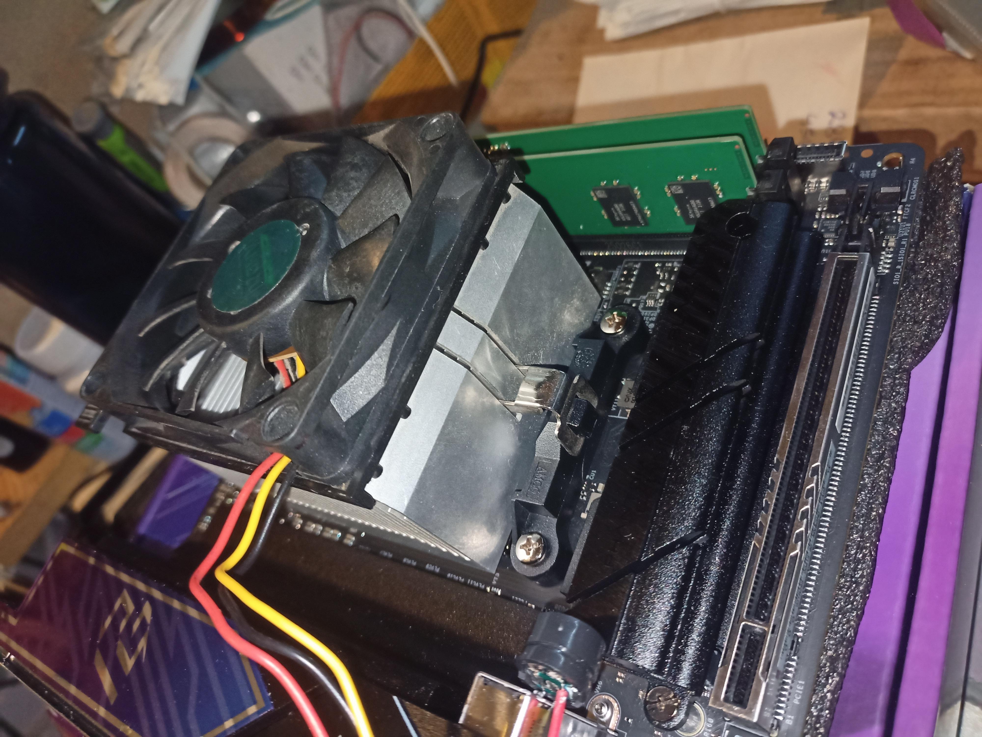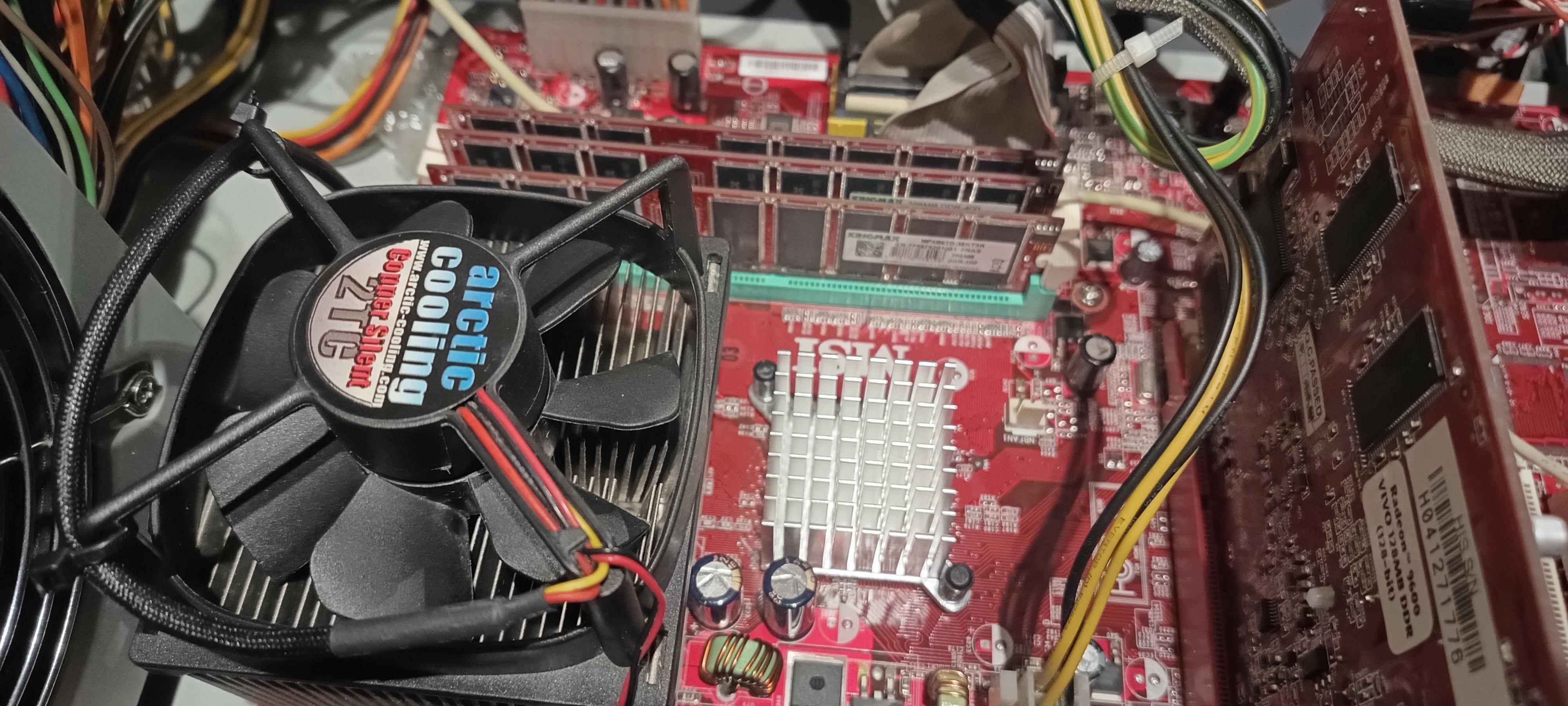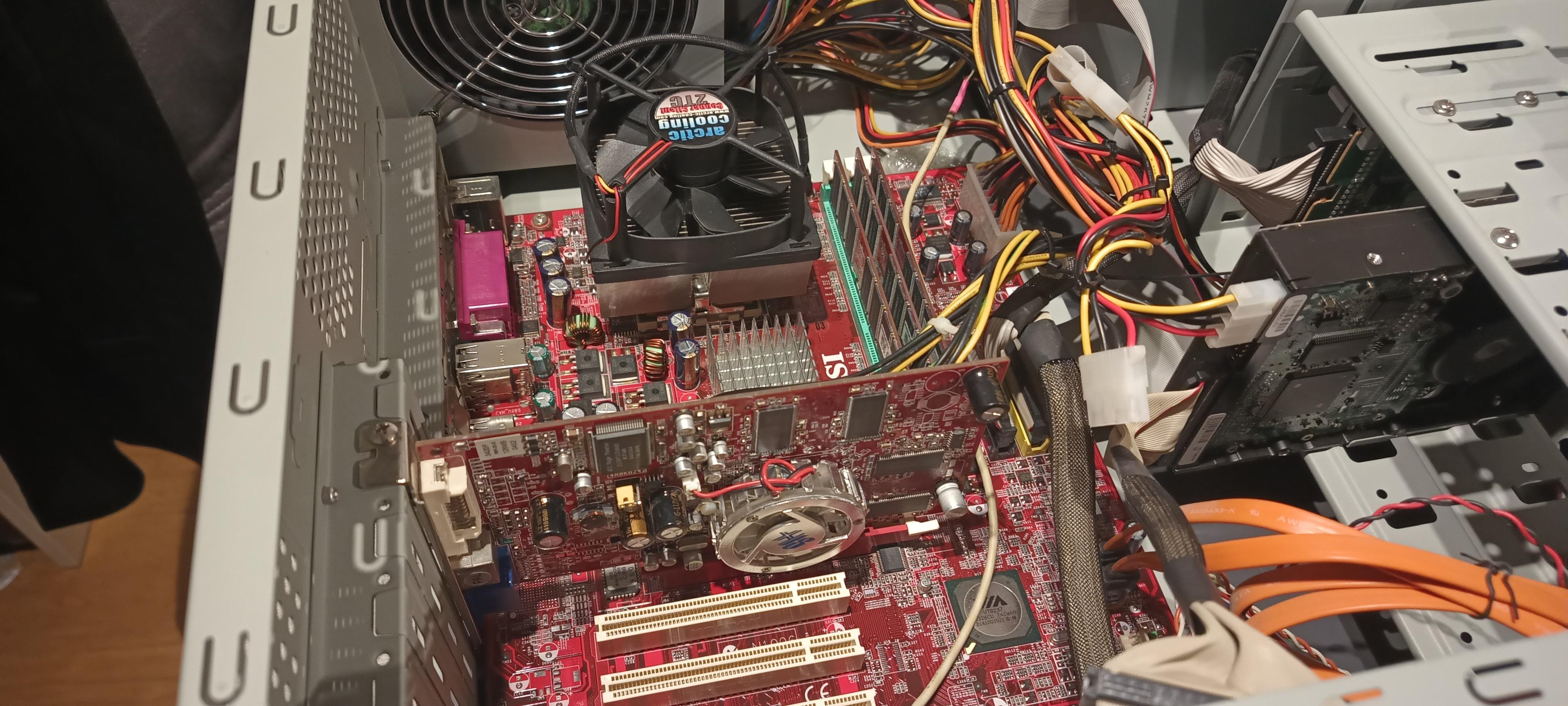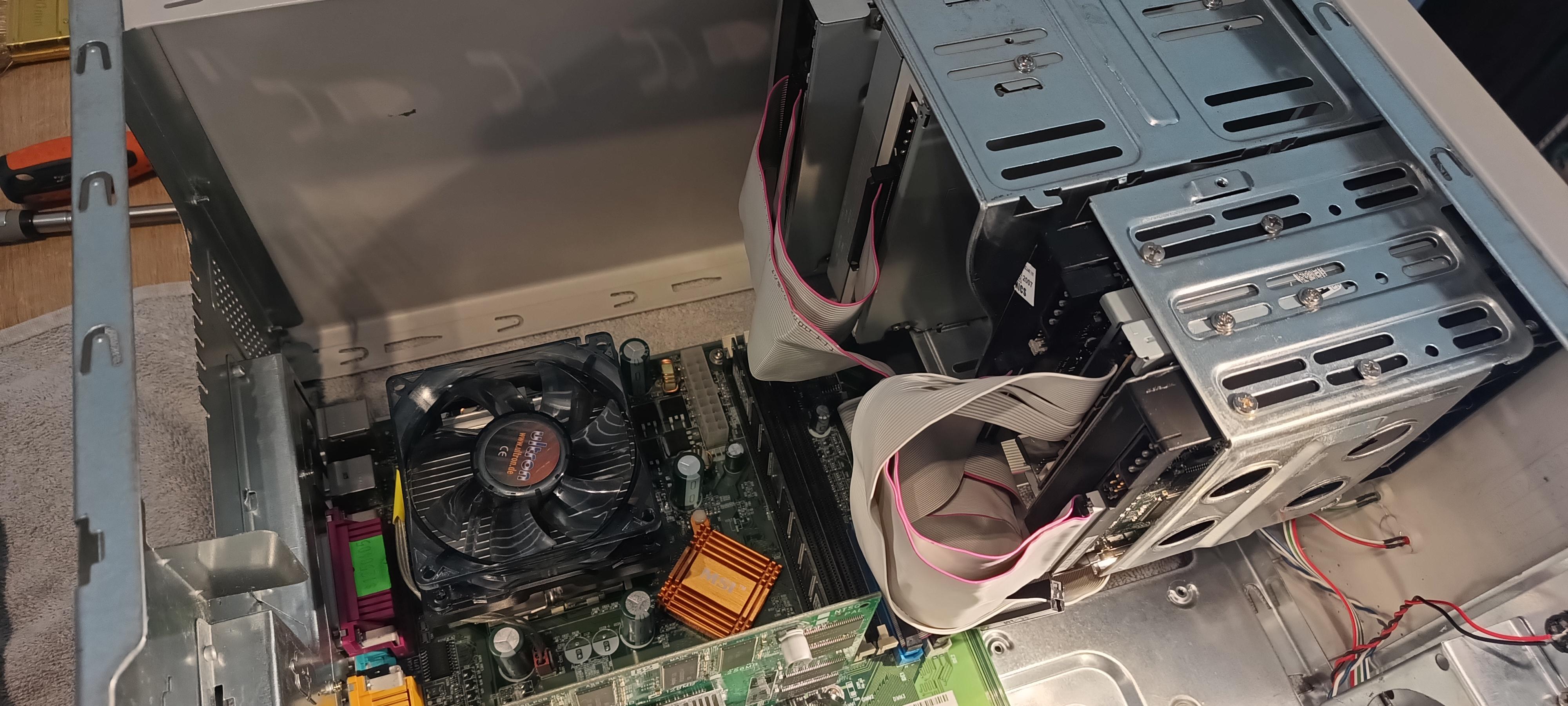 Jako że moje wizje często się zmieniają zacząłem kompletować sobie zżółkły biały zestaw ale zostałem pokonany przez obudowę z zasilaczem montowany na wysokości płyty - Pierwsze pokonały mnie kable ata i ich ułożenie, później zasilacz - za dużo kabli i z wizji "ładnie" zrobiło się "byle się zmieścić"  na koniec wysoki radiator przez co wentylator jest przytkany do samego zasilacza i zrobił się konkretny piekarnik i procesor mimo otwartej obudowy szybko łapie  ponad 70c według bios i aida32, termometrem ciężko było sprawdzić ale jako tako złapane na radiatorze pokazywał 55-58c. Na ten moment szukam obudowy z zasilaczem montowanym nad płytą.
