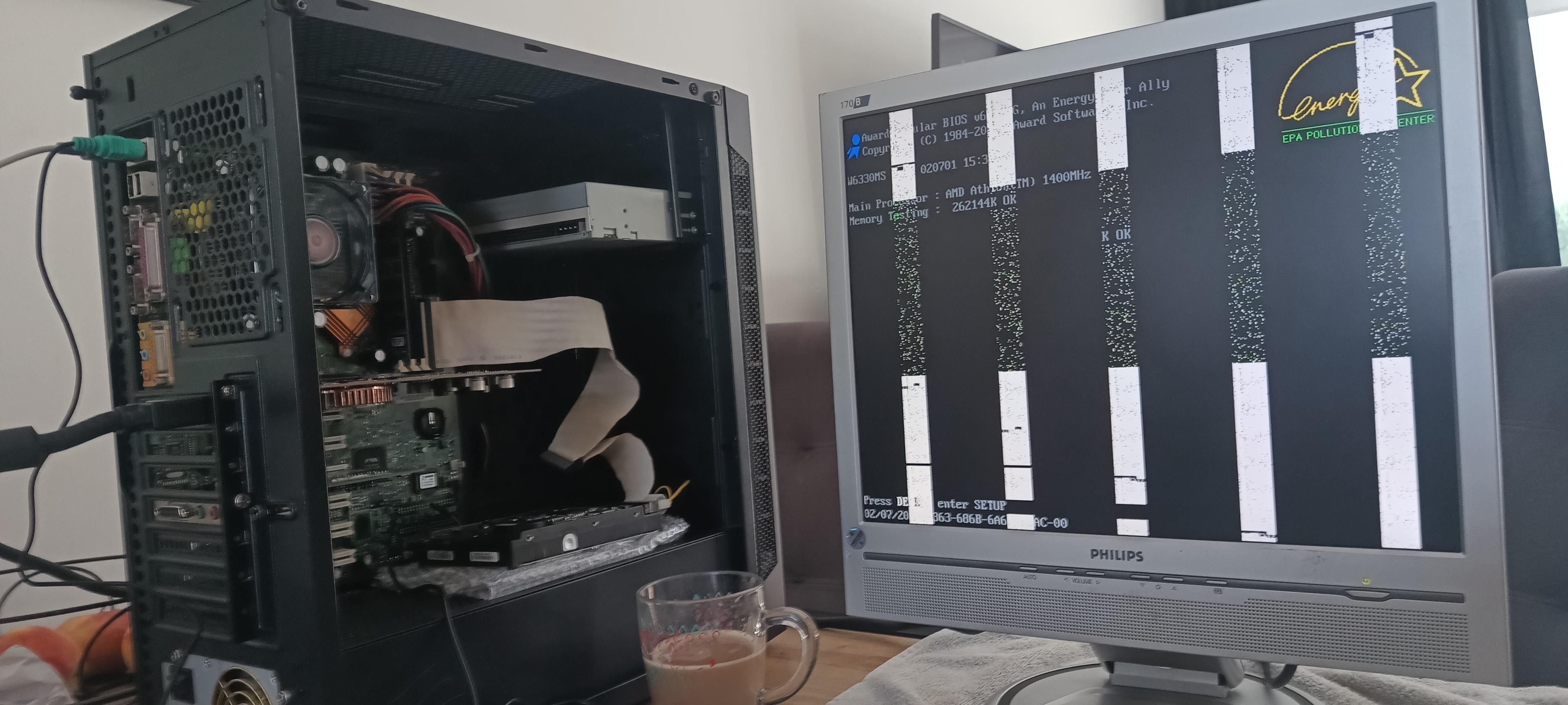 Flashowanie biosu rozpocząłem od wersji F3, następnie F4, F5, skończyłem na F6, w tym czasie również modląc przy tym, żeby elektrownia prądu nie odcięła i nie było jakiegokolwiek kuku, choć ta płyta ma w sobie dual bios, posiadając zapasową kostkę biosu na wszelki wypadek, gdyby coś się stało, co jest bezpieczniejszym rozwiązaniem. Jeszcze jest dostępna wersja F7 oznaczona jako beta, która ma w sobie obsługę Phenomów II X6, ale od tego odstąpiłem. Kończąc na wgraniu wersji F6, sprawdziłem czy bootowanie z USB zadziała, no nadal nie działa, ale za to rozwiązała się kwestia RAMu. Z powrotem wsadziłem komplet 16 GB DDR2 i tym razem się odpaliło. Skoro się odpaliło, to sprawdzam pamięci również jak wcześniej Memtest86+, tylko z podłączonym napędem optycznym i uprzednio wypaloną płytę z programami, skoro bootowanie z USB nie działa na tej płycie. Test stabilności RAMu przeszedł pozytywnie, choć na RAM musiałem zwiększyć napięcie ze standardowych 1,8 V na 1,9 V, gdyż na standardowych sporadycznie w Memtest pojawiają się błędy.