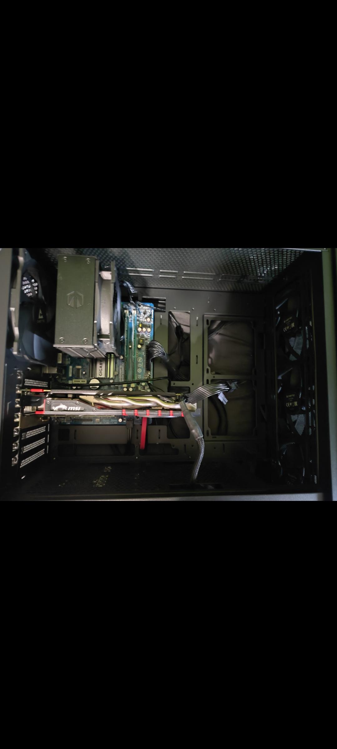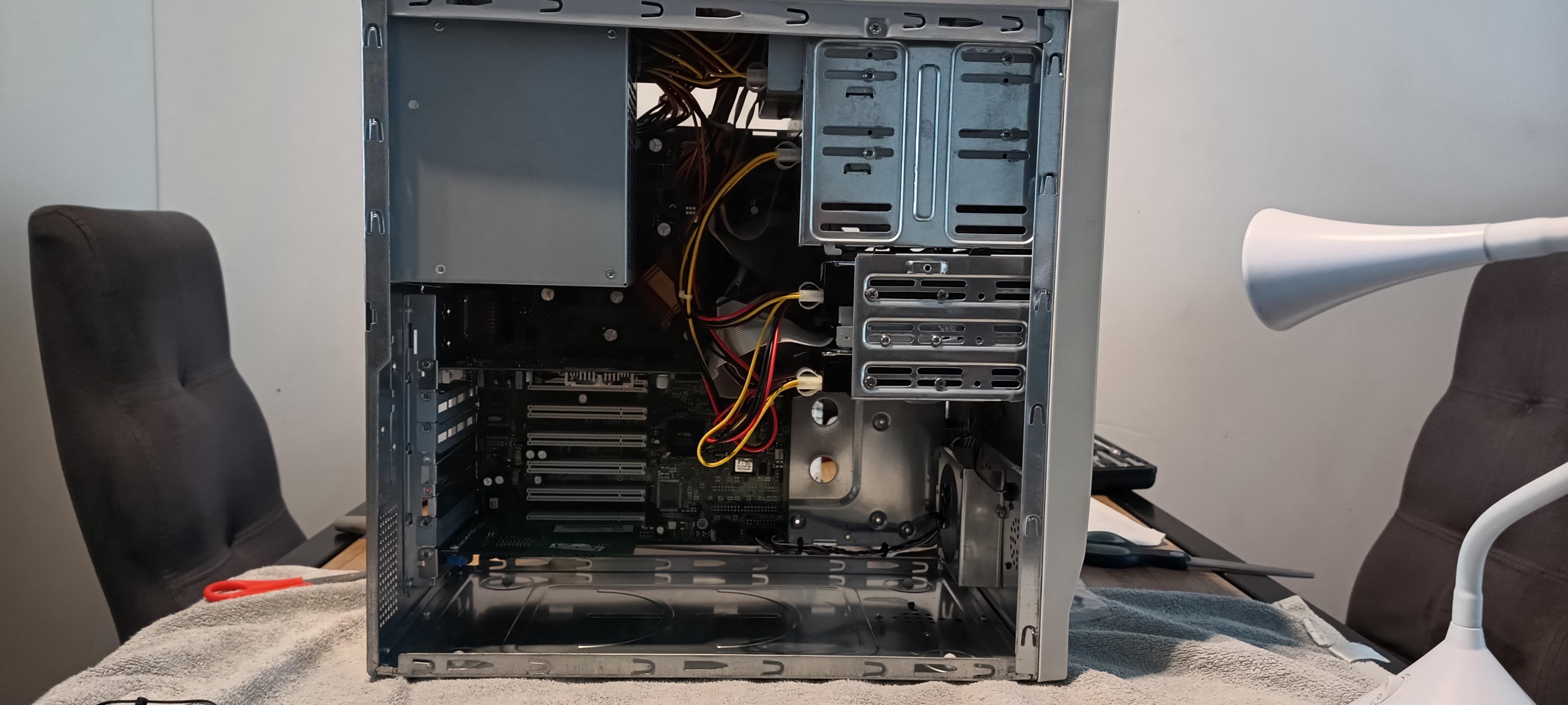 Przełożyłem się do nowej budy. Cable management wiadomo, że nie ma i nie będzie 🤣. Wiem również, że wygląda to jak guano w przeręblu ale co zrobić. Z USB na topie budy nie jestem w stanie skorzystać ponieważ kabel do front panelu nijak się ma do złącz na mobo. Złącze słuchawkowe działa (nie działało w starej obudowie). Dołożyłem walający się po domu dysk 500GB no ale według CDI jego kondycja jest raczej kiepska. Nie chce mi się go już wykręcać.