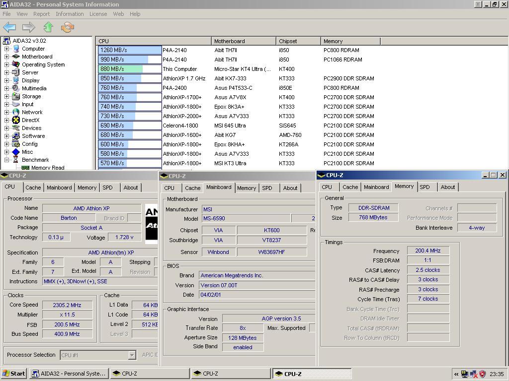 Grzebie dalej przy msi kt6, wpadło chłodzenie arctic copper silent 2TC, spodziewałem się trochę więcej od tego chłodzenia, temperatury są w sumie gorsze ale za to w ciszy - 61c na ten moment najwyższa zanotowana temperatura w aida32. Wpadło również 3x Kingmax 256mb 400mhz cl2.5 co by całość była czerwona, na początku protestowały ale po przeczyszczeniu ipą udało się uruchomić obsadzony cały komplet. Aida odczytuje tą płytę jako kt4 ale za to w cpu z jest już wszystko jak trzeba.