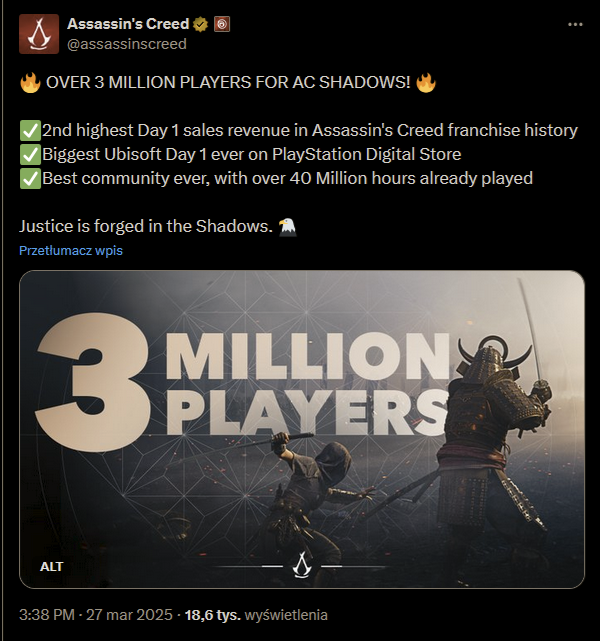 Dla porównania wygooglowałem, że Starfield miał 12 milionów graczy od premiery we wrześniu do grudnia 2023r. Przez prawie rok przybyło kolejne 3 miliony. Oczywiście liczony w tym jest gamepass.