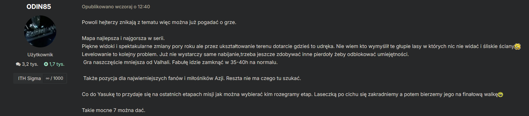 @ODIN85Mam pytanie, bo wiem że ACS już skończyłeś: wiesz w ogóle, o czym była ta gra, biorąc pod uwagę, że skipujesz dialogi? Masz chociaż jakieś ogólne pojęcie, co robiłeś i dla kogo, co udało Ci się osiągnąć w finale, czy tak po prostu sobie pobiegłeś trochę tu, trochę tam, komuś tam uciąłeś głowę, przy kimś innym się poczołgałeś, przyniosłeś 5 skór i zebrałeś 10 kwiatków? Tak się seryjnie zastanawiam, za co tutaj dałeś te 7/10.