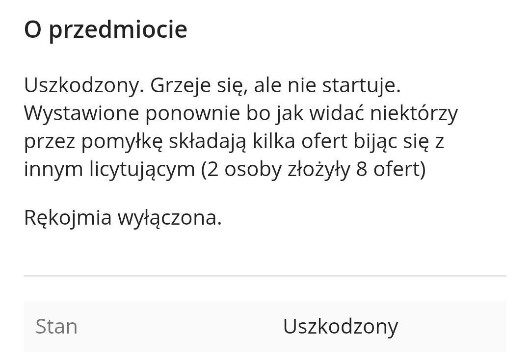 "Sprzedaż od osoby prywatnej - kupujący produkt zapoznał się z ogłoszeniem i akceptuje iż sprzedający wyłącza jakąkolwiek rękojmię na używany sprzęt z tej oferty".