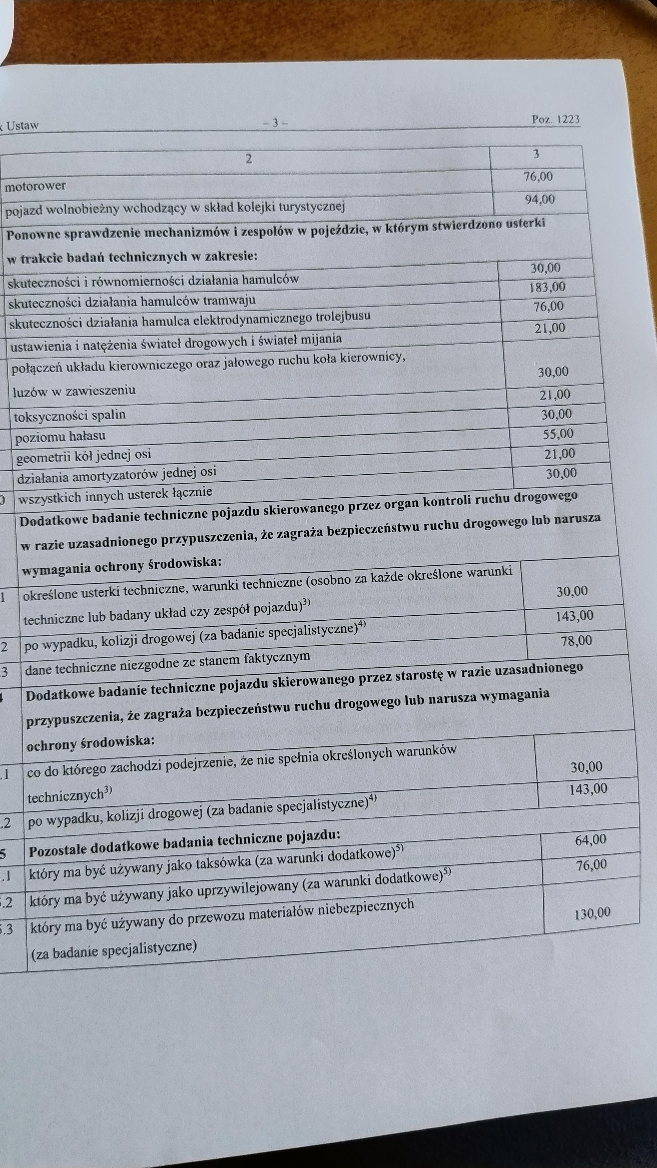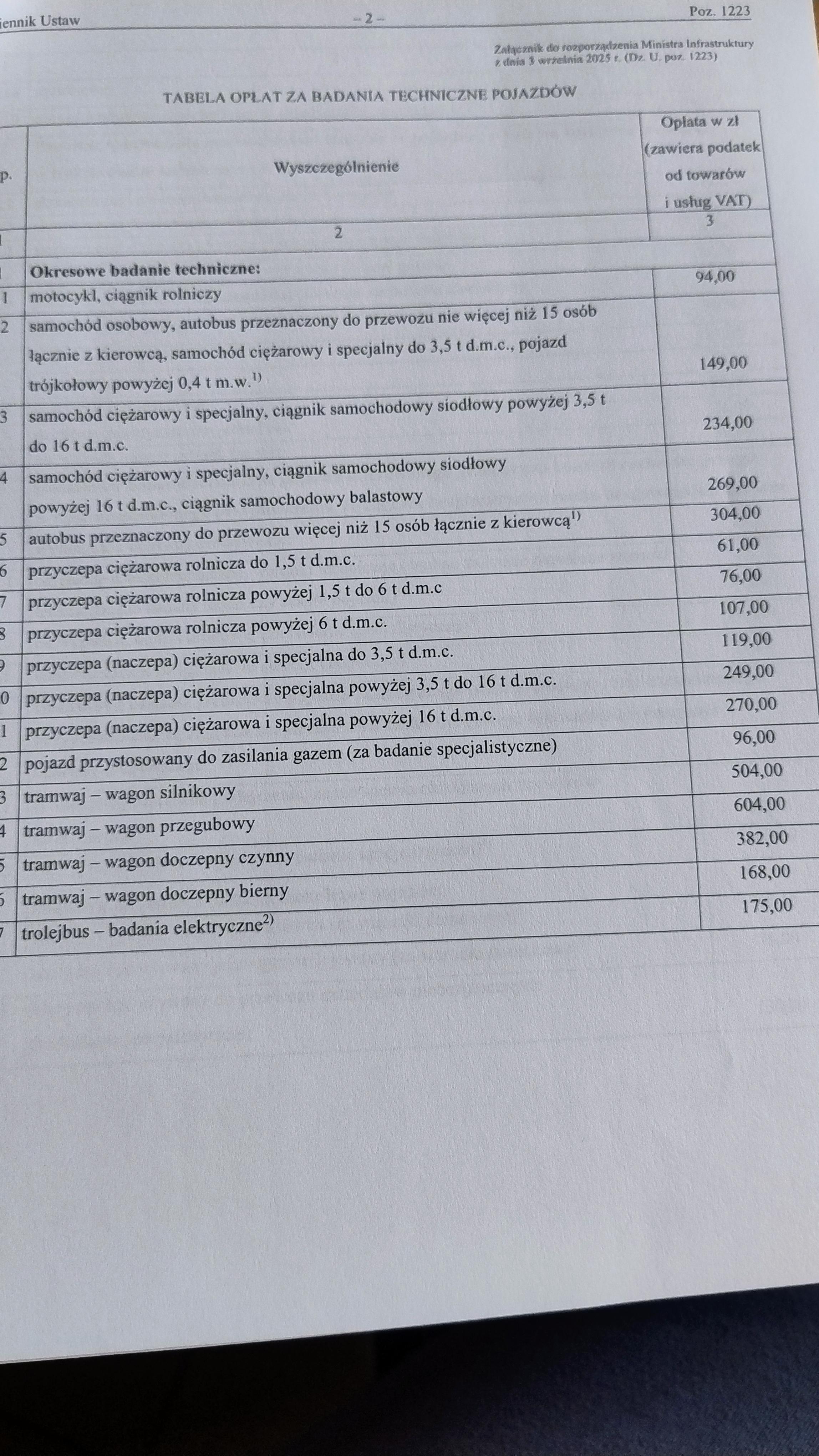 TABELA OPŁAT ZA BADANIA TECHNICZNE POJAZDÓW