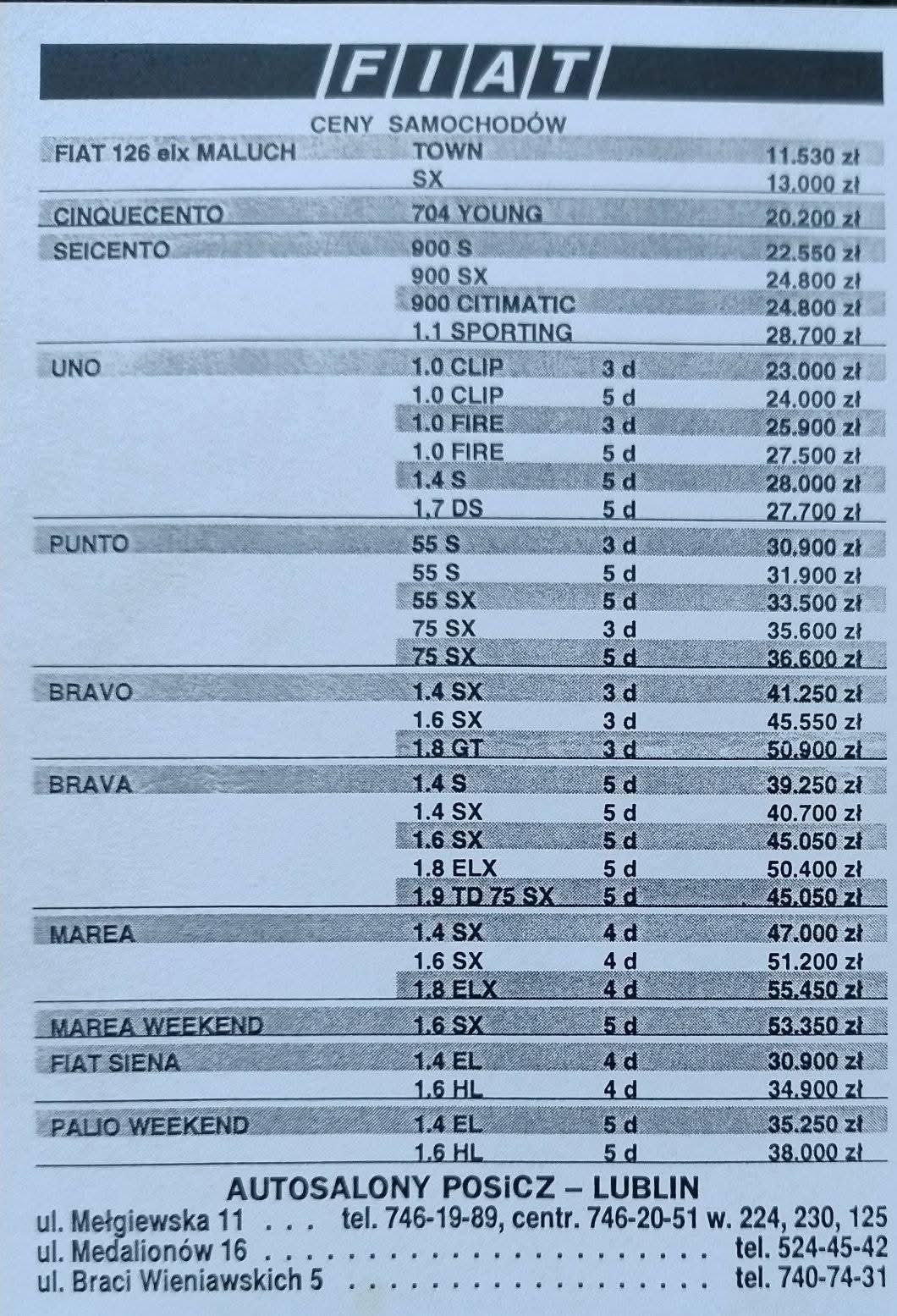 Wiem, że auta dziś są drogie, ale... cennik fiatów z 97 roku: