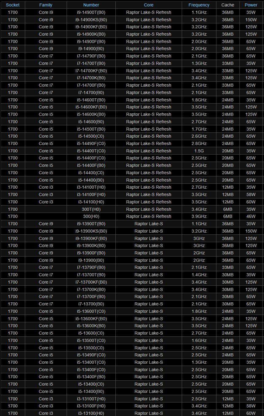 Oficjalnie w 13. generacji od i7 w górę jest Raptor, w 14. tak samo. W 13. poniżej Raptor to tylko 14600K oraz 14600KF, w 14. cztery modele: 14600, 14600T, 14600K, 14600KF. Ale istnieją takie dziwadła jak np. 13400 na rdzeniu B0, ale jak to wygląda od strony praktycznej nie wiem, nie miałem takiej sztuki. Czy np. dodatkowa cache L2 z Raptora jest w pełni odblokowana, czy zablokowana, tego nie wiem.