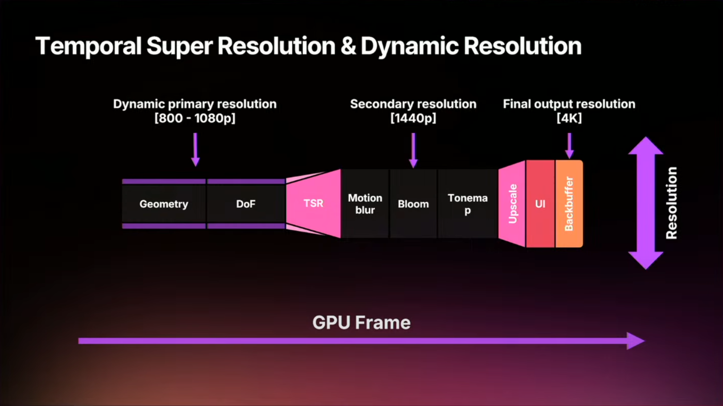 Nie dziwne, że obraz jest taki rozmyty w tym Tech Demo skoro najpierw obraz jest renderowany w rozdzielczości zmniejszanej dynamicznie nawet do 800p, następnie skalowany za pomocą TSR do 1440p, później obliczany Post-processing i kolejne skalowanie z 1440p do 4K. Podwójne skalowanie i związany z tym post-processing w niższej rozdzielczości to optymalizacja, dzięki której obliczanie klatki trwa o niecałą 1 ms krócej. Oczywiście to dotyczy PS5.