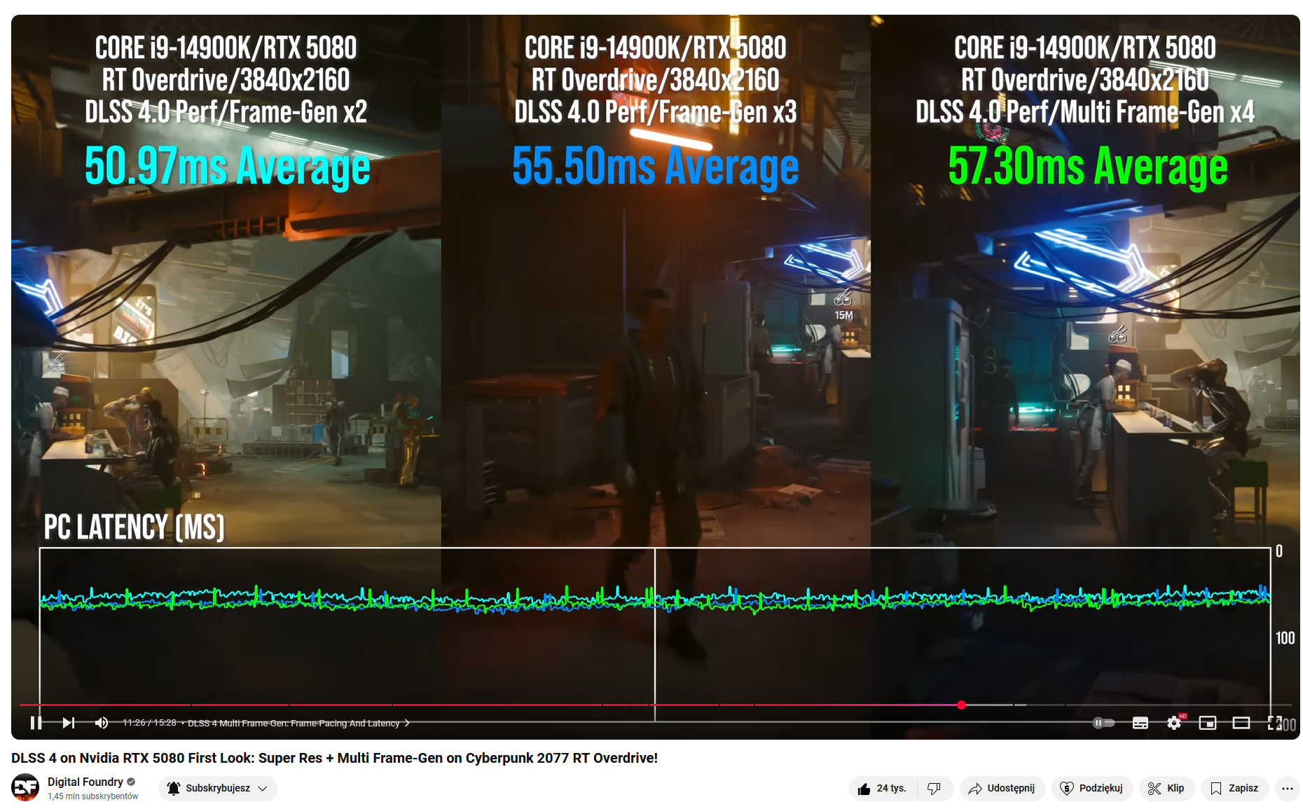Postanowilem w koncu wyprobowac ten MFG w cyberku bo tylko jedna gre posiadam gdzie to jest i musze przyznac, ze miedzy 2x, a 4x nie widze roznicy czy to w jakosci czy lagu. Robilem rozne spowolnienia itp, czary mary, zeby cos zobaczyc ale to bym musial pewnie stop klatki robic i zoomowac. Z tego co widzialem na materialach, to lag wzrasta nieznacznie i osobiscie nie czuje jakiegos dyskomfortu miedzy 2x, a 4x ale ponoc MFG dziala w cyberku najlepiej z wszystkich gier. Jak dotad korzystalem tylko w dwoch grac z podstawowego FG w Cyberku i Horizonie i musze pryznac, ze po prostu dobrze miec taka mozliwosc niz jej nie miec bo za czesto z tego nie korzystam ale w takich ciezkich grach jak cyber czy Alan Wake 2, kotrego mam zamiar w koncu ograc napewno sie przyda i mysle, ze korzysci oraz wady MFG przewyzszaja gre w stosunku do grnia w niskim klatkarzau bo osobiscie 60fps w singu na myszcze to dla mnie malo. DF tez pokazał, ze ten lag nieznacznie wzrasta, a slyszalem rozne komentarze, ze ktos jest te 5ms-7ms w stanie wyczuc :red: Na chwile obecna MSI AB cos sobie nie radzi z pokazywaniem frametime nawet przy podstawowym FG i chyba to wynika ze zmiany modelu bo na poprzedniej wersji FG framtime byl plaski a teraz jakies sito.