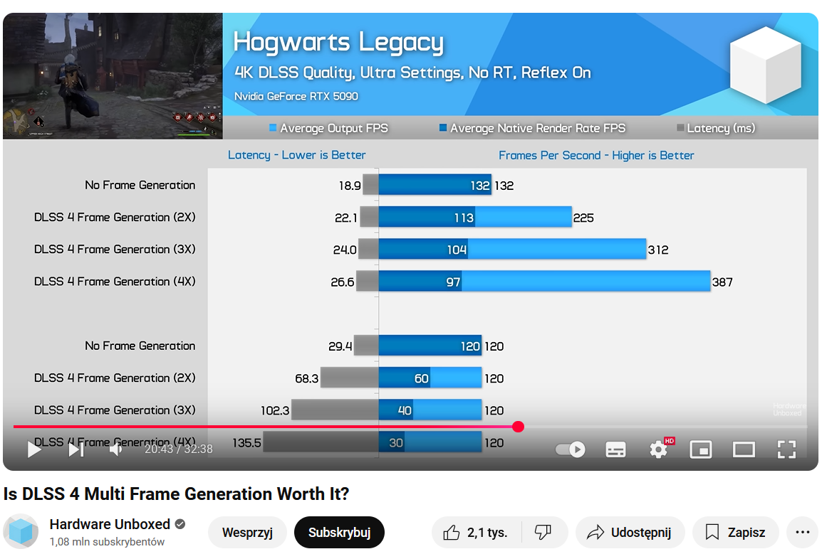 Na mojej karcie graficznej, w rozdzielczości 4K, przy użyciu najnowszej biblioteki generowanie klatki pośredniej trwa teraz około 3 ms zamiast 5,5 ms czyli o ponad 40% krócej.