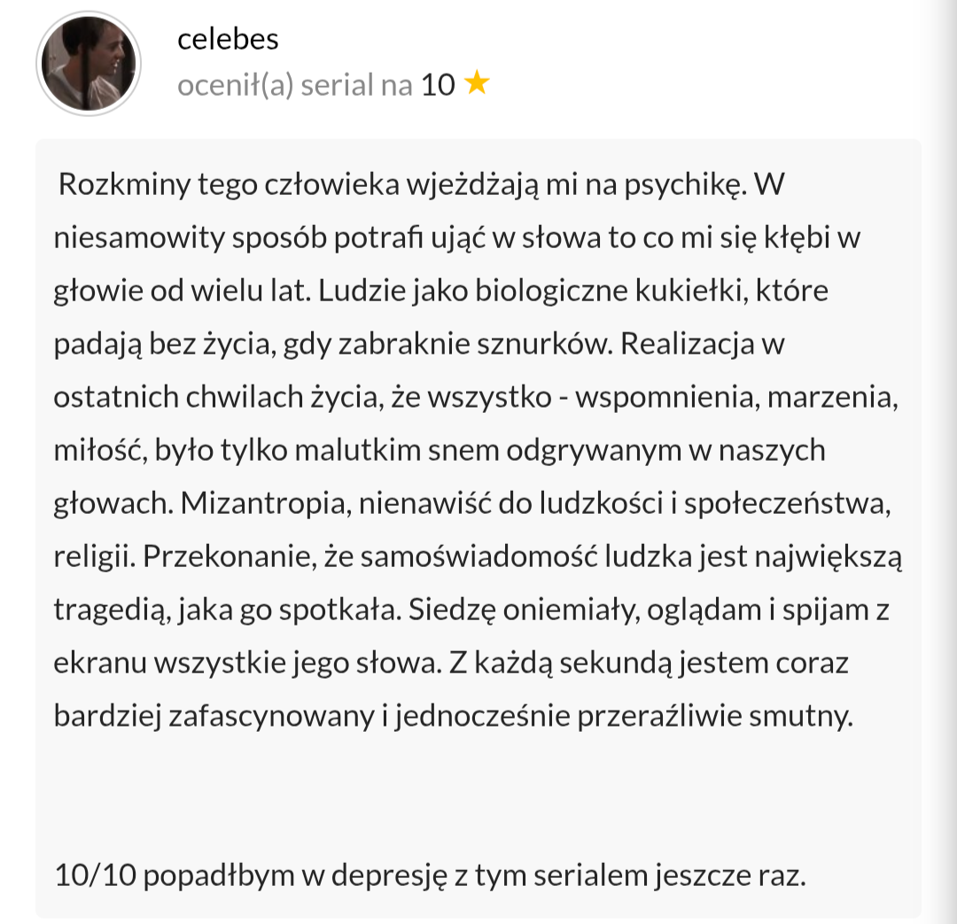 @J4Z66 pierwszy sezon detektywa z McConaughey'em i Harrelson'em to był majstersztyk od siebie też daje 10/10 ;) swoją drogą to oglądnąłem wszystkie sezony ale do pierwszego żaden nie miał podjazdu, chociaż też były całkiem ok. (Jak ktoś nie widział to każdy sezon to oddzielna historia z inną obsadą a nie kontynuacja)