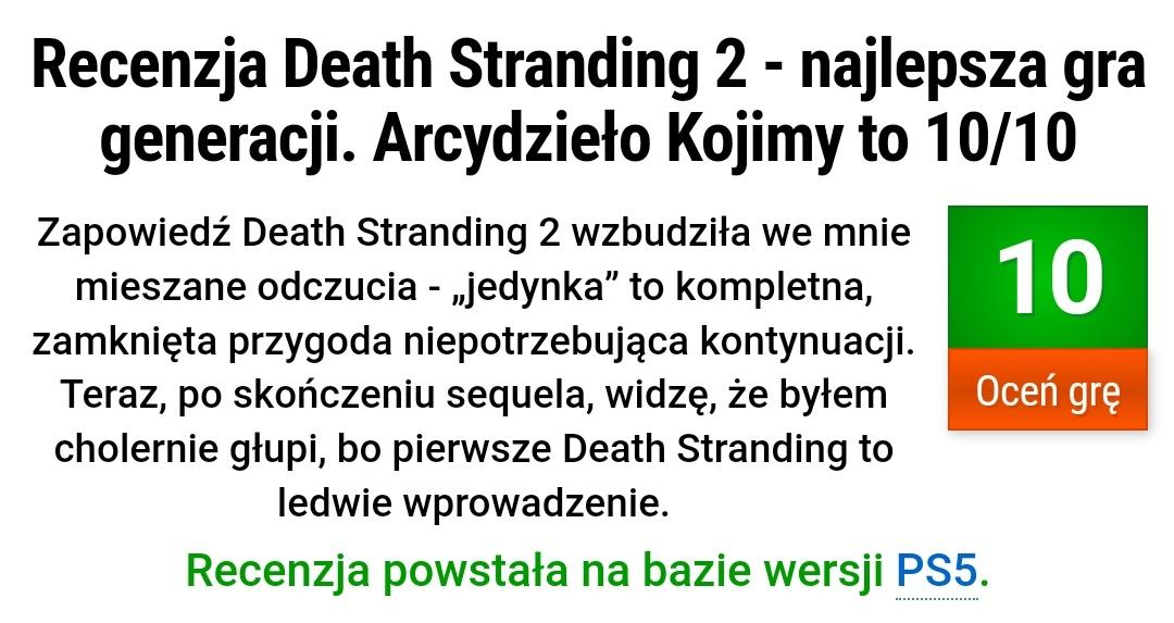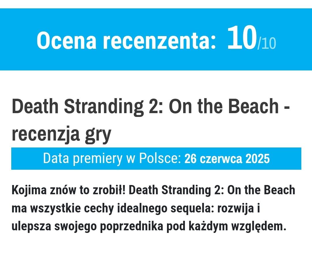 Reddzik 2 762 Opublikowano 23 Czerwca Opublikowano 23 Czerwca Cytat Absurdalnie dobre są też czasy ładowania w Death Stranding 2, bo przejście z menu głównego do rozgrywki zajmuje około sekundy, a wszystkie przejścia pomiędzy lokacjami są płynne, bez ekranów ładowania https://futurebeat.pl/newsroom/gra-ktora-wyglada-jakby-zrobiono-ja-na-playstation-6-recenzja-tec/z12df05 Na pewno zagram na PS5 a kiedyś tam na PC. Jak czytam o grze pod względem technicznym to jest bajka. Wiadomo, że nie będzie super ale nie powinno za bardzo odbiegać i na pewno powinno być po stokroć lepiej niż ten badziewny FF 7 Rebirth https://www.gry-online.pl/recenzje/recenzja-death-stranding-2-hideo-kojima-przeszedl-samego-siebie-i/z64738