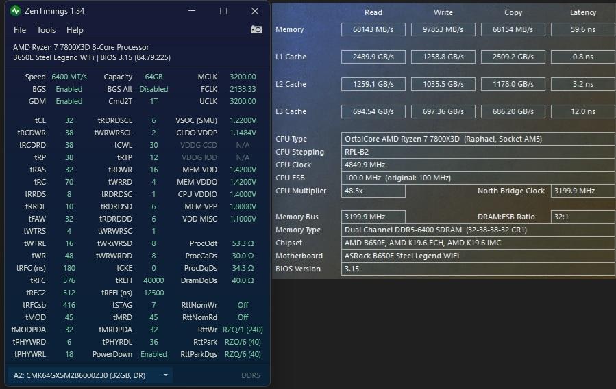 Wpadł mi w ręce RAM 2x32GB (Corsair Vengeance z bazowymi timingami 30-36-36-76). Thaiphoon Burner wskazuje, że A-DIE, zresztą tRFC z załączonego screenu zdaje się to potwierdzać (z tego,  co się orientuję M-DIE kończy się w okolicach 160 ns).