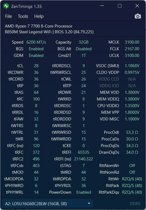 @ 3200 MHz      32-39-39-102  (CL-RCD-RP-RAS) / 141-1311-704-608-96  (RC-RFC1-RFC2-RFCSB-WR)