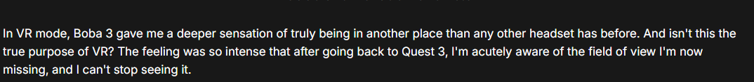 Wielu mówi po obejrzeniu wide FOV, że to naprawdę wiele zmienia. A i tak to co póki co bywało, było dalekie od ideału. Ani to było pełne FOV, ani np. w Pimaxach nie było przynajmniej OK we wszystkim innym. Ten prototyp Boba 3 jest właśnie takim "prawie-wide FOV, ale nie spierdzielony + nic innego nie psuje całości.