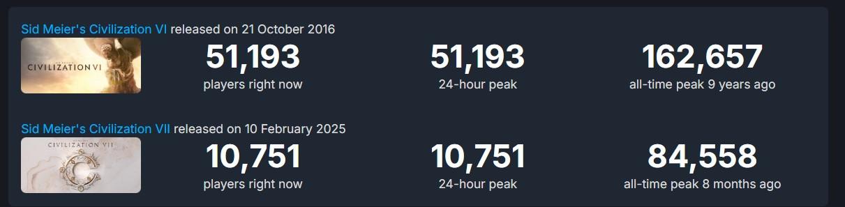 Jak była premiera civ 6 to i tak większość nadal grała w civ 5 przez wiele miesięcy po premierze. Jedynie na premierę civ 6 było ponad 150 tyś graczy ale to przez weekend. I w dodatku civ 6 nie miało żadnej konkurencji w miesiącu kiedy wyszedł na rynek.