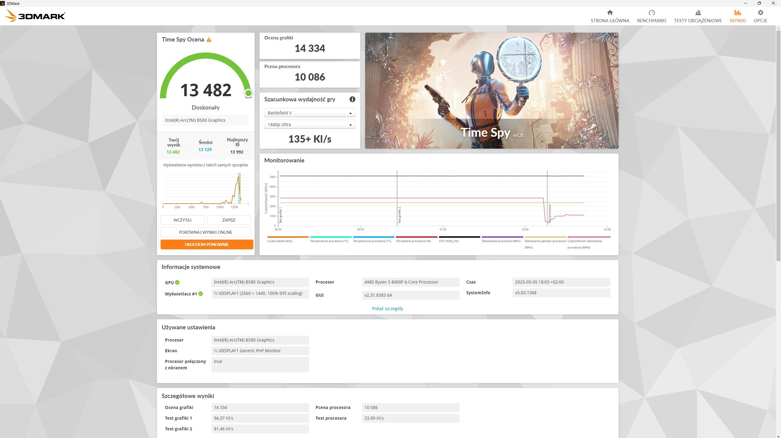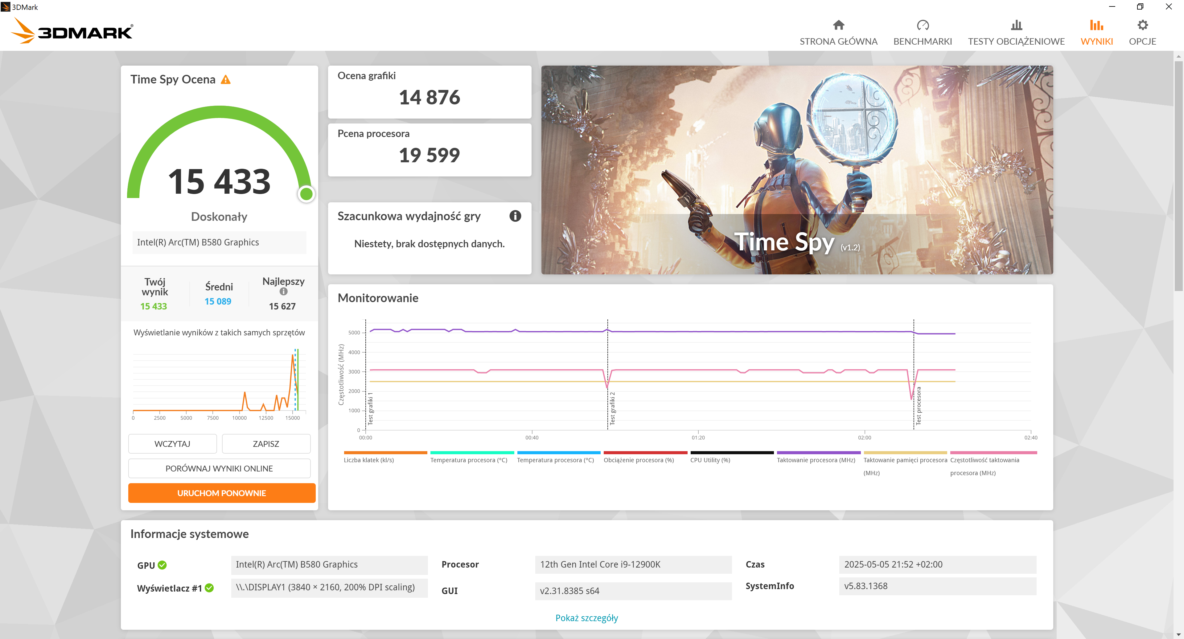 Powyżej są moje wyniki B580 i Ryzena 8400F w 3DMark Time Spy.