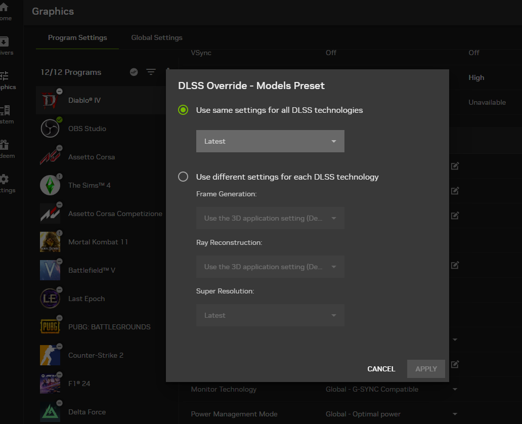 Wchodzi w apce w zakładkę grafika i masz listę gier, klikasz te 3 kropki u góry listy dajesz odśwież. Potem szukasz w ustawieniach na tej liście nadpisanie DLSS.