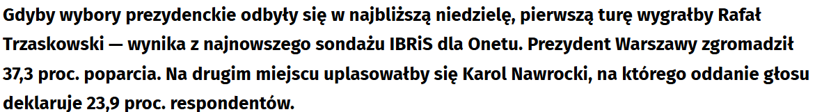 Gdyby wybory prezydenckie odbyły się w najbliższą niedzielę, pierwszą turę wygrałby Rafał Trzaskowski — wynika z najnowszego sondażu IBRiS dla Onetu. Prezydent Warszawy zgromadził 37,3 proc. poparcia. Na drugim miejscu uplasowałby się Karol Nawrocki, na którego oddanie głosu deklaruje 23,9 proc. respondentów